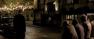 In Hot Fuzz, a secret society of druid-like old farts rule the village of Sandford. They call themselves the Neighborhood Watch Association (N.W.A. for short). These ancient crustaceans sit at a round table and plan their evil deeds. Simon Pegg's character learns of their plans and teams up with his obese beaver partner to take take them down. Along the way, they lampoon some well-known action movies: including Bad Boys and Point Break. One of the enemies of the N.W.A. are the hoodies, pictured here outside the pub: